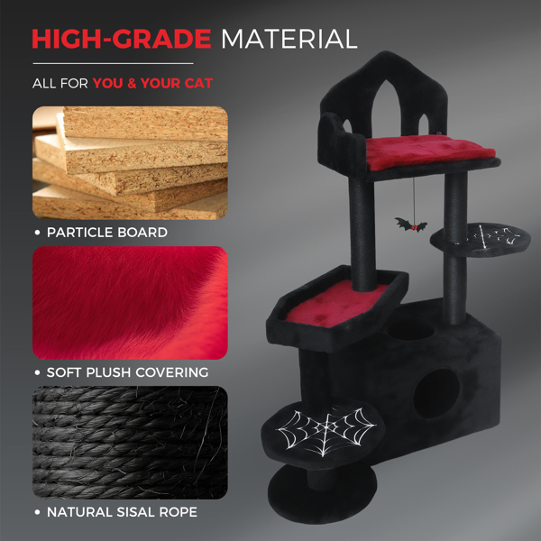 Striking Gothic Design: the Gothic Cat Tree comes with a coffin shaped platform and a spooky cat house. The black and red color combination makes the whole black cat tower look dark and elegant. This is a cat furniture that will attract your cat's attention and a unique Halloween home decoration.